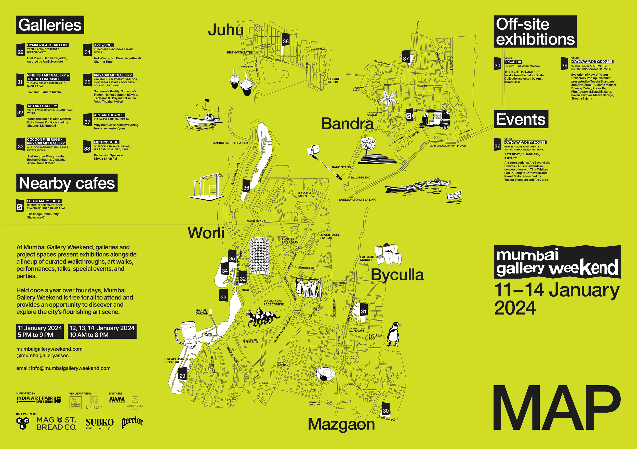 An interactive map of the city’s art districts – south, central, and north – listing all the galleries, special venues and programming for Mumbai Gallery Weekend. Hand drawn illustrations dotted across the map highlight landmarks, depict unique scenes characteristic of each neighbourhood and add a local flavour to the map, inviting viewers to see the city with a different lens.
